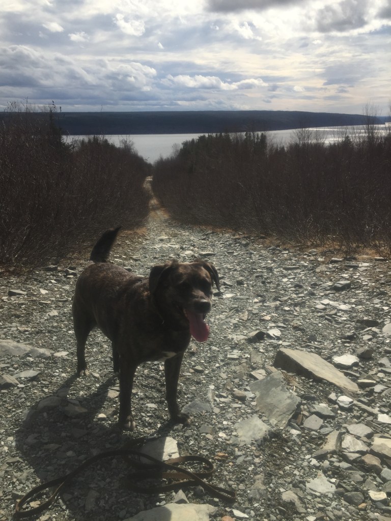 After passing a disappointed, depth confused Callie, at the bottom of this first hill having her fake swim, I think about taking one of the side trails which are gentler … but I always opt for the middle route to the lake which beckons me to run as fast as I can down the steep rock trail. We are now in the woods, away enough for me to forget about Callie, knowing she’ll be safe in her playground, following scents and returning to eyeball me every so often as she explores, I’m ready to enjoy the woods as well and descend to the lake. Huge sigh, a melting through my neck, shoulders, arms as I look down the rock trail, over the tree line and the view of Gander Lake in the distance, knowing I will be there soon…. running that steep hill is nerve racking but I rarely resist the temptation, a scattered time I may walk… part of it…. usually I just run or lean forward and let the hill take me, trying to control my movement as the speed builds, each step thoughtfully choreographed to keep me upright but the possibility of being wrong makes me smile, watch the foot hit, I’m good, yay, watch the foot hit, I’m good, yay, watch the foot hit, I’m good, yay, watch the foot hit, I’m good, yay… can I look up?… try, yes, still safe, lake coming quick, watch the foot hit, I’m good, yay, watch the foot hit, I’m good, yay, look up, almost half way…. a flat reprieve, grassy clearing, remnants of fires and a small path in to the woods where teenagers hang out at night. Once I found two families with kids enjoying my “half way down stop”, glad to see someone besides me appreciating this place….although I do prefer to be alone on this walk as is the case, 99% of the time. Sometimes I stop for a little stretch, sometimes a few yoga poses, sometimes a few strength conditioning sets, sometimes a few pictures, sometimes a fetch with Callie…. always a stare in awe at the beauty of the view, forgetting the town not far behind me, always the thought, I should do this everyday, always grateful this is minutes from my back door.