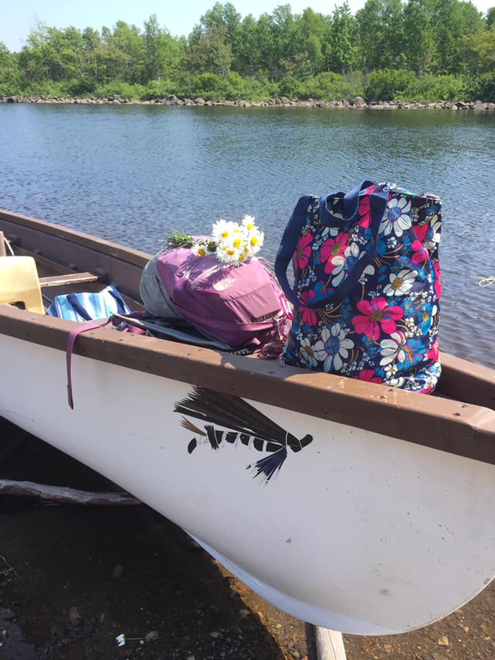 The skill it took to guide us up that river in the thunder and lightning storm with so much water pouring down on us! Captain Dave’s skill going up Big Shoot in such conditions impressed the hell out of me… he stopped and repositioned us in the boat to make it “a little easier” he said. Again when I looked back during the struggle up Big Shoot, he looked apprehensive but still Joanne K and I were laughing. I said to her the next day, still on a igh from the trip, “I can’t believe we were laughing through all that” and she said only a few people would understand and appreciate why we were laughing. Peaceful beauty on the way down, a tranquil indulging swim in calm cold water with hidden surprising currents and then boom… thunder, lightning, pouring rain like we’ve never seen before…. so much more vibrant because we were in the woods in the middle of nowhere away from streetlights, signs, paved roads, houses, buildings… just us on the river in a boat listening to the clapping thunder and watching the light show. Flowers no longer on my knapsack, placed in a cup at the cabin for the boys to enjoy and remember our visit. I could live down there so much easier, Christopher would be happy there, he actually caught his first salmon on the Gander River, very close to the cabin we visited that day…. coincidence? Probably not. I am pretty sure I saw one of my husband’s fishing buddies casting his flyrod at one point early in the trip. Jason was away working for over 30 days at this point, missed the recent crisis at home but I was thinking of all the fishing he’s done on this river…. I don’t think it was a coincidence I saw his fishing buddy while thinking of him and I don’t think it’s a coincidence our journey brought us to the place Chris caught his first salmon. He was such a proud young teen at that time, reminders of better times in the past and maybe a place where we could enjoy better times in the future. I told Christopher and Jason it would be a great family building trip if three of us took our canoe and did it ourselves. I thought there was no way you could get down that river unless you knew it well; then one of my dragon boat buddies told me a group of teens had done it the week before and they made out fine, as a matter fact the only person that flipped a canoe was the one who knew the river. A family trip down the Gander River…. the challenge, the fun, the emotions, the conflict, the decisions we will have to make, the preparation and planning, the togetherness… it’s all exciting me.